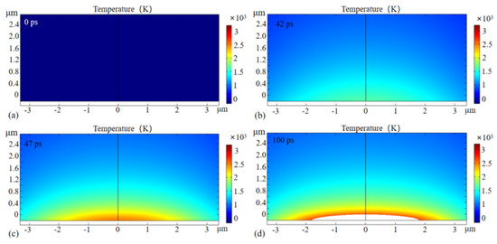 Figure 7 shows the two-dimensional distribution of the lattice temperature when J = 25 μJ and tp = 15 ps. It can be seen that the lattice temperature presents a Gaussian distribution in space, which is due to the energy of the picosecond laser being Gaussian in space. In simulation, the vaporization ablation mechanism was adopted, and only the region where the lattice temperature was lower than the boiling point was filled in the solution domain. The picosecond laser had not yet acted on the silicon at 0 ps, and the lattice temperature was the initial temperature of 300 K. With the arrival of the laser peak, the lattice temperature increased gradually and reached the melting point of 1683.15 K at 42 ps. With the continuous heating of the picosecond laser, the boiling point of 2628.15 K was reached, and vaporization ablation began to occur on the silicon surface at 47 ps. The ablation depth of the silicon was 196 nm at 100 ps. Under the same laser parameters as the simulation, we also carried out the experiments of the picosecond laser ablation of silicon. A picosecond laser system (YPP-IR-30, HUAKUAI, Guangdong, CHINA) was selected with a pulse width of 15 ps, a maximum average power of 30 W, a maximum repetition frequency of 100 kHz and a wavelength of 1064 nm. The ablation depth was characterized using atomic force microscopy (DSM14049BF-1, Bruker, Billerica, MA, USA). The experiments were repeated five times and the ablation depths were 195.5 nm, 204.7 nm, 200.4 nm, 195.2 nm and 215.1 nm, respectively, and the average ablation depth was 202.2 nm, as shown in Table 2. There was a difference of 6.2 nm between the simulation and the experiments, and the error was less than 3.2%. The source of the error should be that the surface topography changed when the surface was ablated.