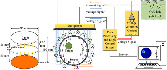 The diagram of the EIT system is shown in Figure 1. There are 16 electrodes evenly distributed on the sensor. The electrode width in this work is 10 mm. The length of the electrode is 25 mm and the height of the electrode sensor is 100 mm. The geometric center of the electrode is located 50 mm from the electrode sensor.