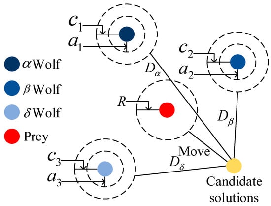 The optimization process of the grey wolf optimization algorithm. Taking as the most suitable solution, the three wolves are guided by , , and during the hunting process, and wolf follows these three wolves.