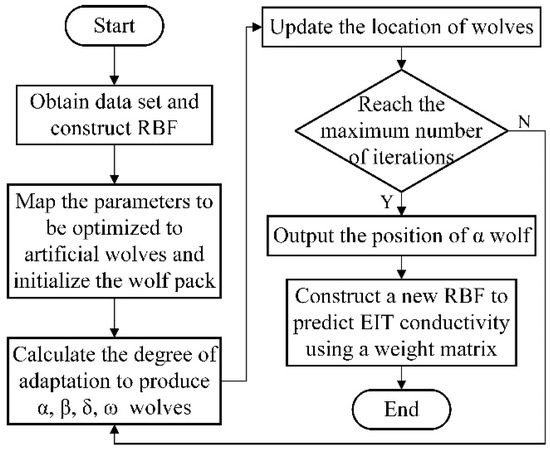 The connection weights of RBFNN are crucial parameters that directly affect the reliability of the predicted EIT reconstruction results. The LSM algorithm subjectively regards the mapping from the implicit layer to the output layer as a linear mapping and needs to calculate the inverse matrix, ignoring the circumstance that the inverse matrix does not exist. To solve this problem, we optimize the connection weights W to improve the prediction accuracy of RBFNN through the GWO algorithm, instead of calculating the inverse matrix. The specific optimization process of the proposed algorithm is shown in Figure 4, and described as follows: