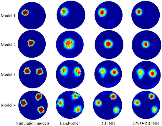 From Figure 6 and Figure 7, it can be seen that the GWO-RBFNN approach developed in this work not only has some noise immunity, but it also has some generalization capacity to adapt to the scenario of multi-target detection. According to the image reconstruction results of the multi-target test sets, when the GWO-RBFNN approach is used for multi-target imaging, the number of target objects is clearly recognized, and the position and size of the detected targets can be correctly displayed. The related RMSE and ICC averages still provide more acceptable results without considerable deterioration, indicating that the approach proposed in this paper is capable of satisfactory generalization.