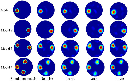To test the robustness of the proposed method against noise, Gaussian white noises of 30 dB, 40 dB, and 50 dB were added to the test sets. Exemplary models with various Gaussian white noises created using the proposed GWO-RBFNN are shown in Figure 7. The findings reveal that all of the models have high-quality image reconstructions.