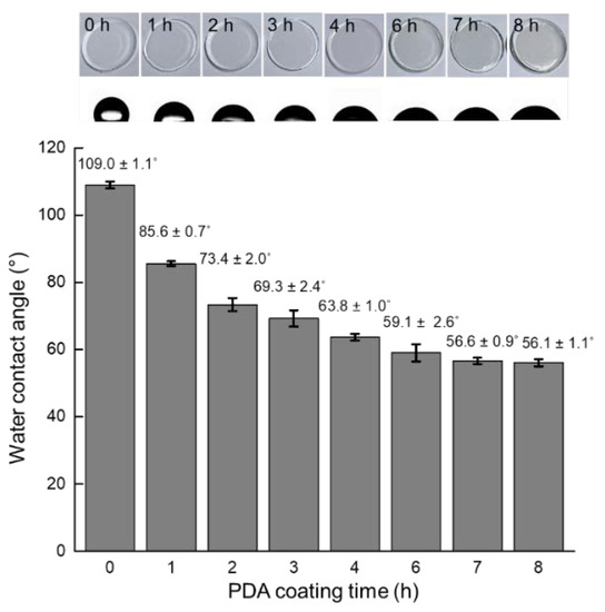 Water contact angles measured on the PDA-coated PDMS surface after coating for 0, 1, 2, 3, 4, 6, 7, and 8 h.