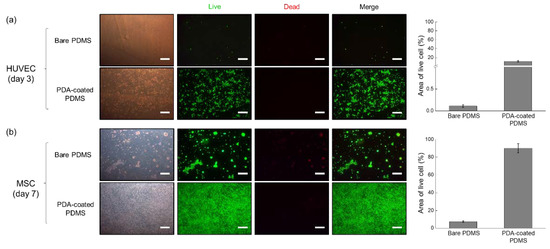 Results of the live/dead cell assays performed on HUVECs and MSCs cultured on bare and PDA-coated PDMS surfaces. The percentage of the area occupied by live cells was calculated using the ImageJ software. (a) HUVECs were cultured for 3 days and (b) MSCs were cultured for 7 days. Scale bar = 500 μm.