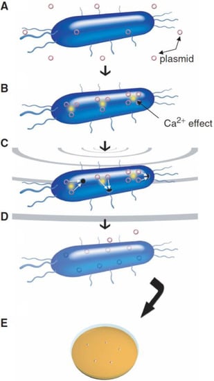 Figure 1. Illustration of proposed mechanism of ultrasound DNA transfer [10]. (A) A bacterial cell and plasmid DNA are suspended in an aqueous solution. (B) 50 mM CaCl2 promotes transformation. (C) Ultrasound generates pores in cell membranes through which plasmids enter the cell. (D) Pores are closed and plasmids are retained in the cell. (E) Bacteria acquire new functions after taking up plasmid DNA.