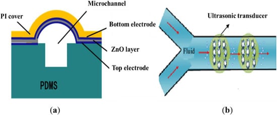Figure 2. Schematic diagram of the microfluidic ultrasound gene transfer system MEMS (a) self-focusing ultrasonic transducer; (b) microchannel.