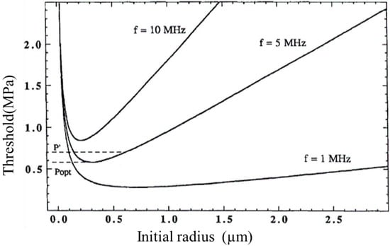 According to the analytical model, there is an optimal bubble size at a given frequency for which the threshold is a minimum. This effect is shown in the computed threshold curves in Figure 3. At higher frequencies, the optimal bubble size for cavitation nucleation decreases because inertial and viscous effects increase with frequency. The minimum pressure threshold from the theory of this optimal bubble size has been computed [36]. Table 1 shows the results for the ultrasound frequency between 1 to 5 MHz.