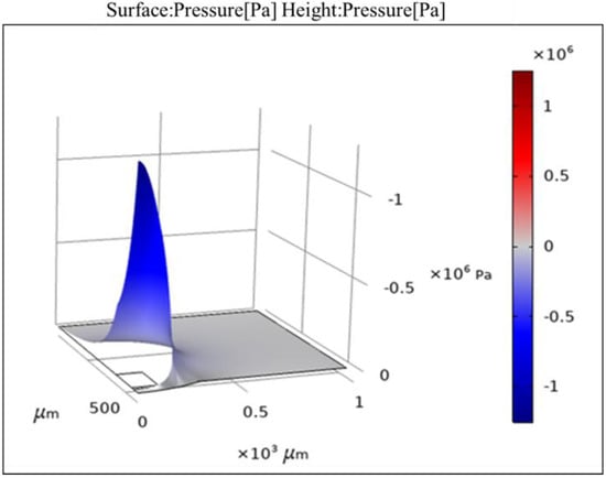 Comparing Figure 5 and Table 1, it can be found that when the AC excitation voltage was 100 volts, the maximum ultrasonic pressure of the fluid in the microchannel was higher than the minimum cavitation threshold of water at the frequencies of 1, 2, and 5 MHz; while at 3 and 4 MHz, the maximum ultrasonic pressure was slightly lower than the minimum cavitation threshold of the corresponding frequency. Furthermore, when the AC excitation voltage increased to 120 V and 180 V at 3 and 4 MHz respectively, the maximum ultrasonic pressure in the microchannel exceeded the minimum cavitation threshold of water at the corresponding frequency. The findings suggested that it was possible to generate microbubbles and form cavitation when the excitation voltage was not too high. Comparing Figure 3 and Figure 5, it can be seen that when the excitation frequency was 1–5 MHz, cavitation with a bubble diameter of 1–5 μm was formed in the microchannel. The simulation results showed that the system proposed in this study was able to form ultrasonic cavitation in the microfluid theoretically.
