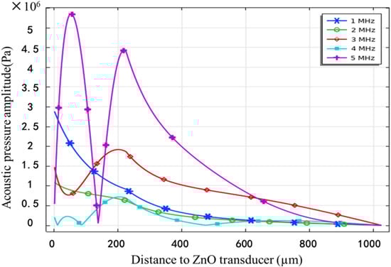 The application-case of the proposed device that the minimum bubble size is to be collapsed is 1 μm, hence the maximum frequency required in operation is 6 MHz. The piezo-acoustic coupling modelling of the system has been carried out with an actuation voltage of 100 V AC and actuation frequencies between 1 MHz and 5 MHz. Figure 4 shows the acoustic pressure distribution in the entire field when an actuation voltage of 100 V AC at 1 MHz is applied. Figure 5 shows a comparison of the acoustic pressure in the liquid along the normal axis for actuation frequencies between 1 MHz and 5 MHz and an actuation voltage of 100 V AC.