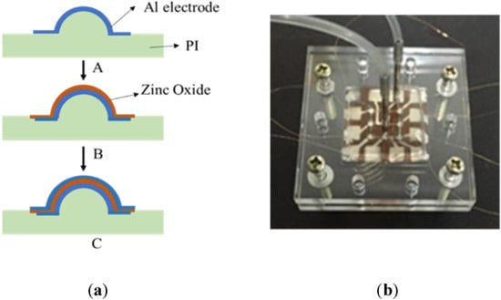 Figure 6. (a) Flow chart of preparation of the self-focusing ultrasonic transducer array on a PI substrate; (b) a picture of the microfluidic transfection biochip.