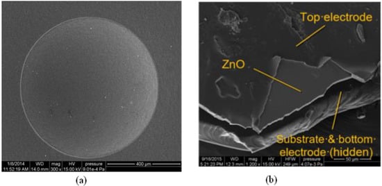 Figure 7. SEM images of the ZnO piezoelectric film self-focusing ultrasonic transducer (a) spherical cap and (b) ZnO film and electrode.