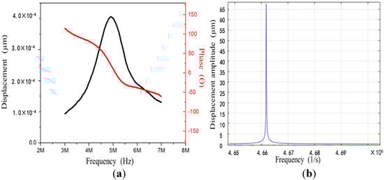 The frequency response of the ultrasonic transducer array was tested with a laser Doppler vibrometer (Displacement Unit., MLD-821, NEOARK Corp, Tokyo, Japan), and the result is shown in Figure 8a. It can be observed that the transducer had the most significant displacement at 5 MHz. The phase angle was 0, which indicates that its resonant frequency was around 5 MHz. Moreover, a finite element simulation of the transducer was carried out, which showed that the resonant frequency was about 4.66 MHz (Figure 8b). This was consistent with the result of the laser Doppler vibrometer. The resonant frequency met the design requirements and could produce ultrasonic cavitation in a microfluid.