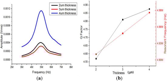 Figure 9. (a) Influence of the thickness of the ZnO piezoelectric film on the Q value of the transducer; (b) influence of the thickness of the ZnO piezoelectric film on the resonant frequency of the transducer.