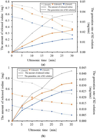 Figure 10. Relationship between the yield of essential iodine, the generation rate and the time of ultrasonic irradiation in KI solutions with different initial concentrations: (a) 2 MHz and (b) 3 MHz.