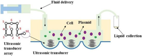 Existing ultrasound-mediated gene transfer technologies are all carried out under a macroscopic volume [26,27,28] using large-scale ultrasonic equipment, such as the horn-shaped ultrasonic radiator or the ultrasonic bath. Relevant studies were only carried out on a macro scale (105–107 cells), and resulted in averaged data. Due to the inhomogeneity of cell responses and the different life or metabolic cycles, the averaged data are often difficult to interpret. To solve this problem, it is necessary to develop new technologies and devices for single-cell operation, high-precision analysis, and high sensitivity detection. Interestingly, with microfluidic technology, the size of a biochip (lab-on-a-chip) is compatible with cell size and is suitable for single-cell operation.