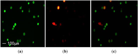 Figure 12. Results of 293T cell stained by FDA-PI: (a) live cells stained by FDA; (b) cells with damaged membranes stained by PI; (c) superposition of Figures (a,b).