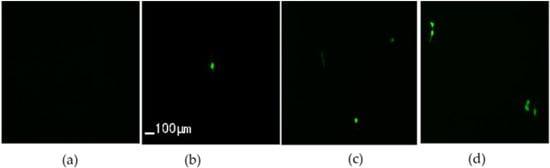 Under a fluorescence microscope, the gene import effect is shown in Figure 13 and the green cells indicate successful import. Figure 13a shows the control group with plasmids added to the cell suspension without ultrasound. Figure 13b,c respectively represent the results of acting with one transducer, and Figure 13d represents the results of acting with two transducers simultaneously.