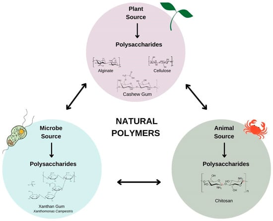 Natural polysaccharides (Figure 1) are produced naturally without human intervention and are found in plants (algae, plant exudate, seeds, fruits, tubers and cereals), animals (bovine, swine and crustaceans), fungi (P. ostreatus and Agaricus blazei) and bacteria (Xanthomonas ssp., Leuconostoc spp and Sphingomonas elodea) [].