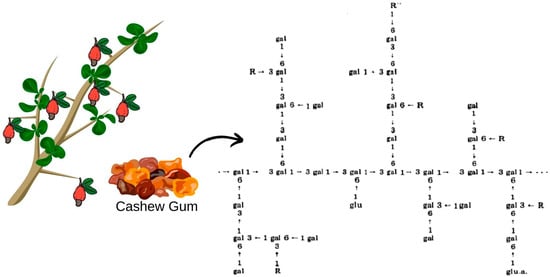 Cashew gum extracted from trees in the northeast region was characterized as a branched heteropolysaccharide containing in its structure (Figure 2): β-D-galactose (72–73%), α-D-glucose (11–14%), arabinose (4–6.5%), rhamnose (3.2–4%) and glucuronic acid (4.7–6.3%) by mass percentage []. In addition, it presents advantages in relation to gum Arabic, such as: lower ash content, indicating a lower degree of impurities even in the non-purified sample; higher protein content, which can provide better emulsifying properties, desired in the encapsulation processes of oils and aromas; high fiber content, being higher than gum Arabic and other traditional materials; and lower viscosity after extrusion, which can contribute to better dispersion and solubility in solutions [,]. Therefore, cashew gum could be indicated as a substitute for gum Arabic, and its commercial standardization would raise Brazil to a significant exporter in the international market, thus reducing the import dependency and creating a highly competitive product in its export share [].
