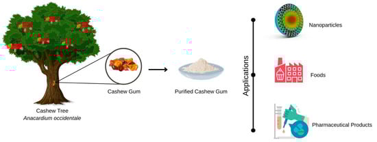 Several natural gums are used by the food and pharmaceutical industries, e.g., as emulsifiers, disintegrants, emollients and additives. Because of their biodegradability, biocompatibility, non-toxicity, hydrophilicity and high viscosity, they are present in many pharmaceutical products as a component for suppositories (agar), in cosmetic products (gum Arabic, xanthan gum), as a stabilizer in toothpaste (xanthan gum), and in modified drug delivery systems (guar gum, locust bean gum, xanthan gum) []. Table 1 summarizes examples of natural gums and their applications in pharmaceutical and food products. Among all the studied and applied gums, some are still little explored in both areas, such as cashew gum.