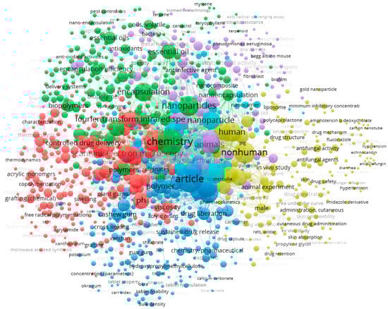 A survey in Scopus database generated a total of 824 published papers that combine both “cashew gum” AND “pharmaceutics”. VOSviewer was used to obtain the bibliometric map shown in Figure 4 [,]. Six clusters of terms were generated, demonstrating the wide range of uses of this polysaccharide in biomedical applications (e.g., development of nanocomposites, biodegradable films responsive to stimulus materials, gel dressings and controlled release tablets, and chemical engineering of new polymers, oxidation, sulfation, carboxymethylation, acetylation or copolymerization).