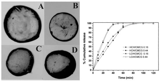 Optical microscopy of different chitosan/carboxymethyl cashew gum (CH/CMCG) microspheres. (A) HCH/CMCG 0.16; (B) HCH/CMCG 0.44; (C) LCH/CMCG 0.16; and (D) HCH/CMCG 0.44 and effect of chitosan (CH) molar mass and degrees of substitution (DS) of chitosan/carboxymethyl cashew gum (CMCG) on in vitro release profile of BSA (Adapted from Magalhães et al. (2009) [], Copyright© 2009, Elsevier Ltd).