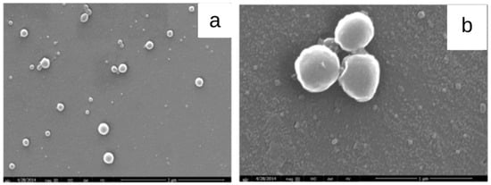SEM images of acetylated cashew gum (ACG) nanoparticles (a) without and (b) with diclofenac diethylamine (DDA) (adapted from Dias et al. (2016) [], Copyright© 2009, Elsevier Ltd).