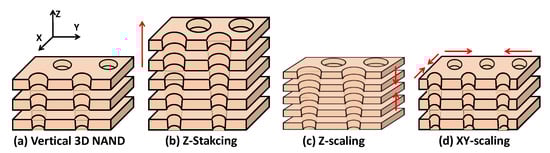 Over the past decade, NAND flash memory technology has been transformed from 2D NAND to 3D NAND. As of today, the 8th generation of 3D NAND (i.e., the number of NAND bit cells in a string >200 stack) is about to be ready for mass production. There still exists some technical challenges for next-generation 3D NAND products [], such as retention issue originated from charge trap layer, coupling issue by floating channel structure, and/or manufacturing TAT (turn-around-time) by process complexity, etc. Among them, the device design for achieving higher memory density becomes trickier. In other words, the physical size of NAND bit cell should be aggressively scaled down for higher memory density with better performance and less power consumption as well as cost effectiveness []. When it comes to scaling down the physical dimension of a 3D NAND cell, three possible approaches, i.e., z-stacking, z-direction scaling, and xy-direction scaling, would be available (see Figure 1) []. Showing off how advanced the 3D NAND technology has been, the z-stacking has been the conspicuous approach for implementing high memory density. With the help of the z-direction scaling, the total height of a string was not increased as much as the number of vertical wordlines. In reality, the height of vertical channel hole has increased by 1.5 times, while the number of vertical wordlines (i.e., the number of 3D NAND bit cells in a string) has increased by two times []. It is expected that the pitch between two neighboring channel holes becomes widened, as long as the vertical channel hole is slightly tilted. However, the pitch along the xy-direction was not increased with the help of improved dry etching techniques as well as the adoption of double-deck etching scheme (i.e., two separate etching steps for a single channel hole) [].
