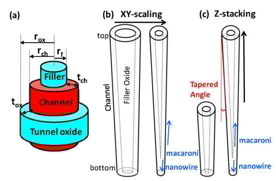 A Gate-all-around (GAA) device structure has been adopted for NAND Flash memory device, so that the channel region was surrounded by gate oxide (more specifically, tunnel oxide). In addition, a macaroni device structure in the 3D NAND bit cell was used/formed because of the oxide filler (see Figure 2a). Taking into account the device structure in 3D NAND, the shape of the channel hole would evolve from a macaroni into a nanowire, in the end. In this work, two cases for the shape of the channel hole are investigated, one is associated with xy-direction scaling, and the other is with z-stacking. With the xy-direction scaling, the radius of the channel hole at the top and bottom cells would be scaled down together (see Figure 2b). However, because of a certain tapered angle, the radius of the bottom cell in a string should become shorter than the radius of the top cell in the same string (see Figure 2c). When considering together both xy-direction scaling and z-stacking, it is likely for the channel hole to become a nanowire.