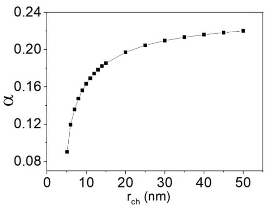 Plot of α (in Equation (3) for SS) vs. rch, when both tox and tch is 5 nm. Note that α is significantly decreased if rch is 15 nm or shorter.