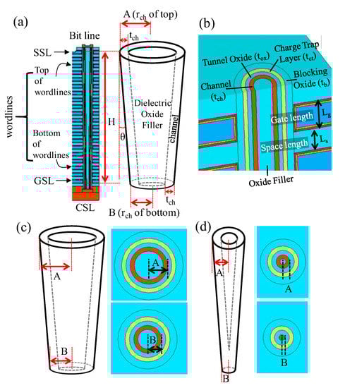Using the Synopsys Sentaurus technology computer-aided design (TCAD) tool, the impact of xy-scaling and z-stacking on the electrical characteristics of 3D NAND cells in a string are evaluated. Based on practical design rules for mass production in industry, tapered angle (θ), gate length (Lg), space length (Ls), blocking oxide layer thickness (tb), charge trap layer thickness (tct), and tunnel oxide layer thickness (tox) are set as 0.3°, 29.0 nm, 22.0 nm, 8.5 nm, 5.0 nm, and 5.0 nm, respectively (Figure 4a,b). The channel thickness (tch) is set/limited to 5.0 nm, if the diameter is long enough (Figure 4c). However, once the radius of the bottom cell (rch, B) becomes smaller than 5.0 nm by xy-scaling and by the tapered angle (θ), the channel structure becomes a nanowire (Figure 4d).