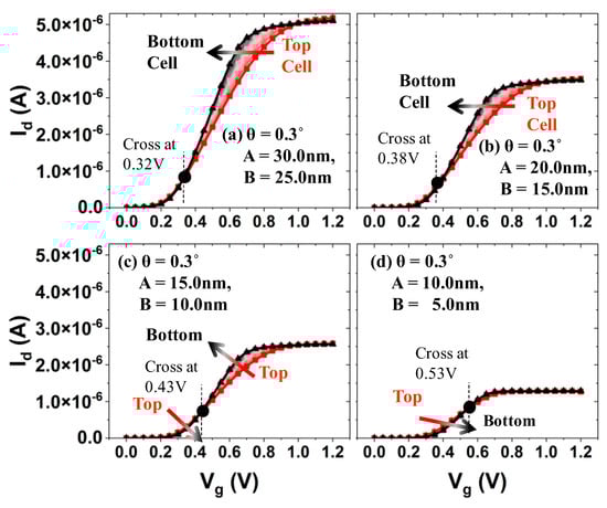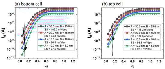For a few combinations of A and B (determined by scaling in xy-directions), Figure 7 shows the simulated input transfer characteristics of the bottom cell and top cell. For all the combinations, the subthreshold swing of bottom cells (Figure 7a) is better than that of top cells (Figure 7b). As a result, for an identical scaling in xy-directions (of course, with constant tapered angle in this work), the input transfer characteristics of the bottom cell is more varied than that of the top cell (see the black-colored arrow in Figure 7).