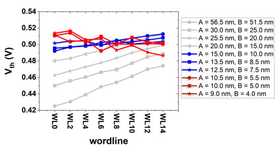 Depending on the physical dimension of the channel radius, the threshold voltage of each bit cell in a string is different from that of the others (see Figure 8): (i) for the range of (A, B) = (20.0 nm, 15.0 nm)~(56.5 nm, 51.5 nm), the bottom cell in the vertical string has a lower threshold voltage than the top cell. (ii) For the range of (A, B) = (12.5 nm, 7.5 nm)~(15.0 nm, 10.0 nm), the threshold voltage of top and bottom cell becomes comparable. (iii) For the range of (A, B) = (9.0 nm, 4.0 nm)~(10.5 nm, 5.5 nm) (herein, the bottom cell has a nanowire structure), the bottom cell has a higher threshold voltage than the top cell.