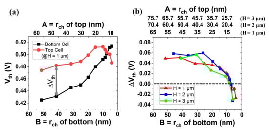In Figure 9a, the estimated threshold voltage for various channel diameters is summarized. Note that the bottom channel radius (B) of 3D NAND in mass production is in the range of 40~50 nm []. By the xy-direction scaling, the threshold voltage of the top cell and bottom cell slightly increases, if B is > 20 nm. However, if B is 10 nm or below, the threshold voltage of the top cell becomes lower (notice that, if the threshold voltage is determined by the constant current method, the threshold voltage of the top cell becomes relatively lower than that of the bottom cell; see Figure 5). In Figure 9b, by the xy-scaling, the threshold voltage difference (ΔVth) between the top cell and bottom cell is summarized. Moreover, in order to figure out the impact of z-stacking on ΔVth, ΔVth for a higher H (i.e., 2 µm or 3 µm instead of 1 µm) was included in Figure 9b. It turned out that the way how ΔVth is varied by xy-scaling was not significantly affected by the height of the stack (H).