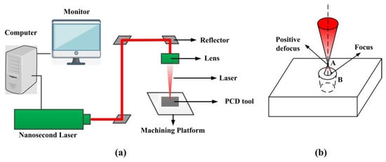 A PCD tool with a medium grain (0.01 mm) was used (supplied by Xiamen Golden Egret Special Alloy Co. Ltd., Xiamen, China). Its density was 4.25 g/cm3, and the elasticity modulus and Poisson’s ratio were 1147 MPa and 0.07. Its hardness was approximately 8000 HV (3–5 times higher than that of cemented carbide) and the thermal conductivity was 700 W/(m K). The nanosecond laser was used to prepare textures on the PCD tool surface. The high laser power of 20 W was selected due to the high hardness of PCD tools. The laser-control system and optical system are shown in Figure 1a. Since the laser had an asymmetric active area, the focused spot was elliptical. The lens used to focus the laser beam onto the stage was an M Plan Apo NIR 50X (Mitutoyo Co., Kanagawa, Japan) with a NA of 0.42 and a focal length of 4 mm. The M2 size was less than 1.4. The laser wavelength was 1064 nm, and the pulse duration and frequency were 100 ns and 20 kHz, respectively. The outgoing beam diameter was 6.5 mm. The processing method of the texture tool was positive defocusing, as shown in Figure 1b; consequently, a micro-pit with a chamfer was prepared.