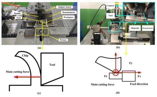 The experimental setups for orthogonal cutting and micro-turning are shown in Figure 2. In the orthogonal cutting experiment, the workpiece made of SiCp/Al composite materials with sizes 10 × 10 × 0.8 mm was cut 20 times, and the cutting forces were averaged. The cutting depth was 0.02 mm and the cutting speed was 200 mm/s. In the turning experiment, a cylindrical bar with a diameter of 5 mm was selected. The cutting speed was 3000 rpm, the feed rate was 10 mm/min, the cutting depth was 0.015 mm, the turning length was 20 mm/time, and the cutting results were evaluated after 10 turnings. The definition of cutting forces is shown in Figure 2c,d.