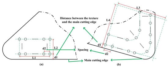 The location and size of textures were based on the orthogonal cutting experiment of non-textured tools in order to place the texture in complete contact with chip in the later machining experiment of textured tools. The tool–chip interaction area in case of non-textured tools was detected by SEM images. After the area observation, the texture size for orthogonal cutting experiment was designed as L1 × L2 = 200 μm × 1000 μm, as shown in Figure 3a, and the size for micro-turning experiment was L3 × L4 = 500 μm × 500 μm, as shown in Figure 3b. In orthogonal cutting experiments, the texture position was determined by the distance d1 between the first row of pits and the main cutting edge, and pit density was determined by the pit spacing d2. These two parameters varied as follows: d1—25 μm, 35 μm, and 45 μm; and d2—20 μm, 40 μm, 60 μm, 80 μm, and 100 μm. These results were combined in 15 textured tools in addition to one non-textured tool. The tools are enumerated in Table 1.