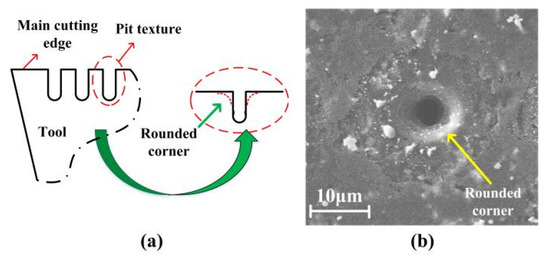 - The micro-pit array texture with rounded corners was formed by exploding the plasma on the surface of the PCD tool. These corners were designed to smooth the chip flow during the machining.