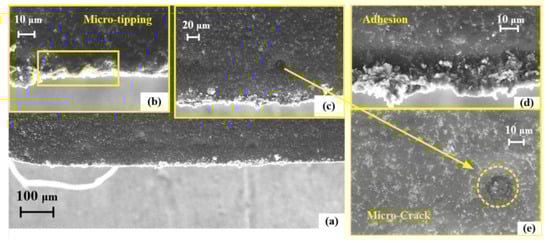 Figure 6 shows an SEM image of the non-textured tool surface after the orthogonal cutting of the SiCp/Al composite was performed 20 times. Since the SiCp/Al composite contained hard reinforcing SiC particles, the tool wear was very serious. It can be seen from Figure 6a,c,e that there were many micro-cracks with circular shapes, which were mainly generated by the pressing of the SiC particles onto the tool surface during machining. The size of the crack area was close to the particle size (2 to 12 μm). Due to the high plasticity of the aluminum matrix, serious adhesive wear occurred at the main cutting edge, as shown in Figure 6d. Meanwhile, since the SiC particles were in contact with the main cutting edge for a long time, micro-tipping can be observed, as shown in Figure 6b.