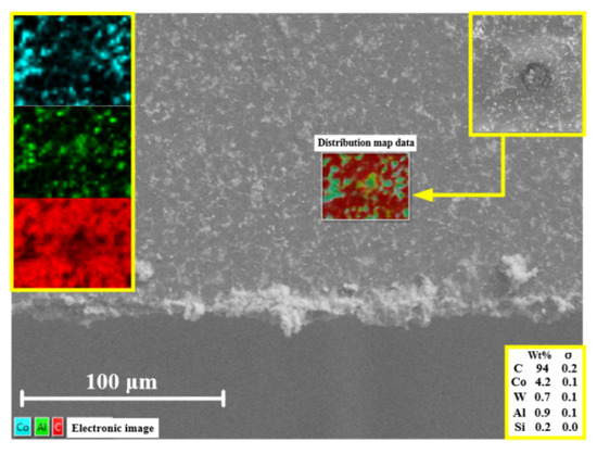 Figure 7 shows the energy-spectrum image of the non-textured tool surface in the area near the crack (black spot). Carbon was mainly found to be distributed in this region, with only a small amount of aluminum and silicon. This was caused by the adhesive SiC particles indenting into the tool surface, as well as some broken SiC particles during machining. The aluminum matrix was pulled into the grooves as the chips slid on the tool surface.