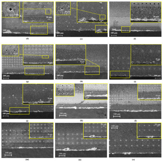 Black wear scratches were seldom found on the surfaces of the chips machined by the textured tools. Only in the case of the largest distance d1, in Figure 10k–o, did these wear traces appear; however they were much slighter than when machining with the non-textured tool (Figure 9). Furthermore, the scratch size was smaller. This phenomenon reflected the three-body friction during the machining. The micro-pitting-texture reduced the direct contact of the SiC particles with the rake face, thereby reducing the wear of the tool surface.