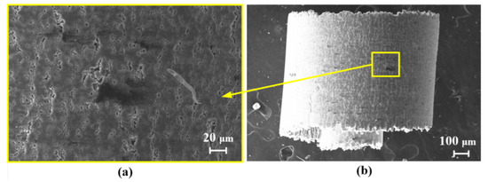 As in the previous section, the SEM image of the chip machined by the non-textured PCD tool is first shown in Figure 9. The whole chip was not broken, but many cracks were observed on the chip surface. Furthermore, some black traces appeared on the surface (Figure 9a). Its width was around 10 μm, which roughly corresponds to the size of the SiC particles. The reason for its formation may be that the local heat was difficult to dissipate due to the low thermal conductivity of the SiC particles, leading to an oxidation reaction on the surface of the chip, resulting in the abrasion of the particles. The dark and light black traces indicate that some of the particles rolled and other were scratched at the interface.