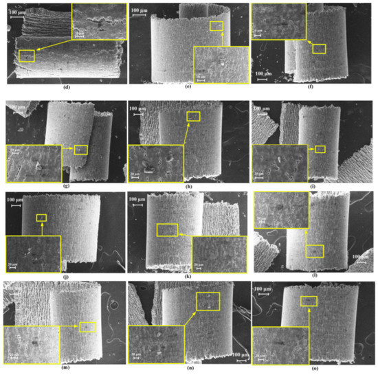 SEM images of the chips machined by the micro-pit textured PCD tool are shown in Figure 10. Compared to the case of the non-textured tool, these chips had larger curvature, and the chips appeared to break more easily. When the texture was far from the main cutting edge (increase of d1), the chip curvature obviously decreased (see, for example, the value of d2 = 60 μm in Figure 10f,h,m). As this distance increased, fewer micro-pits interacted with the chip; the chip curvature therefore tended to be that of a non-textured tool.