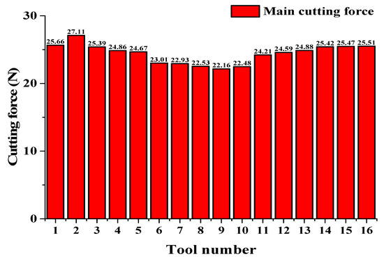 The cutting force was measured by a three-axis dynamic piezoelectric force-measuring instrument (Kistler 9256C, Winterthur, Switzerland) with a frequency 2 kHz. The main cutting forces of the non-textured tool and all the textured tools are shown in Figure 11. It can be seen that not all of the textures reduced the cutting force. When the micro-pitting-texture was too close to or too far from the main cutting edge, the cutting force was even greater than that of a non-textured tool (Tool 1 with d1 = 25 μm for d2 = 20 μm and Tool 16 with d1 = 45 μm for d2 = 100 μm). The reason for the first case probably lies in the increasing surface stress of the tool texture. In the latter case, the texture did not play an important role, since the texture was far from the intense interaction region, and the cutting force was approximately the same as that of a non-textured tool. The cutting force also did not change monotonically with pit spacing. The smallest cutting force appeared when the texture position and pit density were appropriate, with distances d1 = 35 μm and d2 = 60 μm (Tool 9 with cutting force reduction of 14% compared with the non-textured tool).