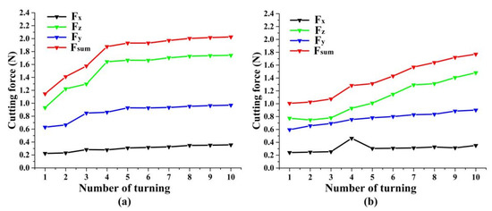 Figure 12 shows the values of the cutting forces of the non-textured (Figure 12a) and textured tool (Figure 12b) in 10 turnings: Fz is the main cutting force in the direction perpendicular to the tool surface (green), Fy is the force parallel to the tool surface (blue), and Fx is the force in the feed direction (black). Fsum is the square root of sum of the squares of the cutting forces Fx, Fy, and Fz in all three directions (red). It can be seen that Fx is almost the same in two cases, and Fy is slightly lower in the case of the textured tool. The pits with rounded corners increased the flowability of the chip. The texture mainly affected the main cutting force Fz. It was obviously reduced with the textured tool. The main reason for this is that the SiC particles played a rolling or supporting role between the tool and the chip, thereby reducing the cutting force.