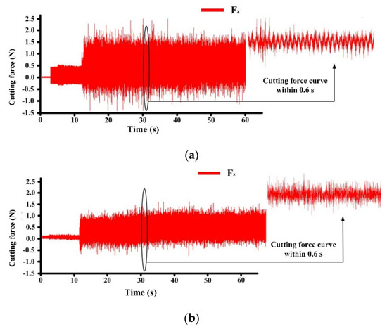 The main cutting forces Fz in the z-direction during one machining are shown in Figure 13. The reduction is clearly observable. The extracted data within 0.6 s also shows that the textured tool had a better cutting stability. The average Fsum value of the non-textured tool over 10 cuttings was 1.7887 N, while for the textured tool, it was 1.3831 N (reduced by 22%).