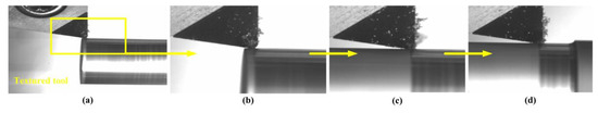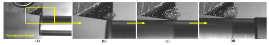 Snapshots taken at some stages of the turning process with the non-textured and textured tools are shown in Figure 14 and Figure 15. During the machining by the unstructured tool, the chips and the tool were always in an adhesive state (Figure 14b–d). Increasing numbers of chips collected at the tool tip. The adhesive wear of the tool was caused by the adhesion of the aluminum. The textured tool showed good chip evacuation and transport during the machining (Figure 15b–d). This resulted in reduced cutting force and longer tool life.