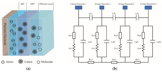 Figure 1. (a) A diagram demonstrating the structure of the electrode–electrolyte interface; (b) the equivalent circuit diagram of a four-electrode conductivity sensor with AC excitation applied to current electrode and voltage drop measured by voltage electrode.
