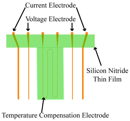 In this work, a 525 μm thick 4-inch P-type <100> silicon wafer with high accuracy, good consistency, and low cost is used as the substrate. Essentially, electrode design is the most crucial part in the design of silicon-based thin film conductivity sensor. In designing a multi-electrode conductivity sensor, each pair of electrodes has strict spacing requirements. To reduce the parasitic capacitance, positions of current and voltage electrodes should be strictly symmetrical. As shown in Figure 2, the four-electrode design separates the voltage electrode from the current electrode, which can further weaken the electrode polarization phenomenon. The proposed sensor integrates four parallel strip electrodes, serving as current and voltage electrodes. Furthermore, a temperature electrode with a twisted alignment is also designed between the two voltage electrodes. In addition, platinum metal with good chemical stability and corrosion resistance is used as the material for the electrodes. Its resistance value varies linearly with temperature, and hence, it is used as a temperature compensating electrode. Moreover, silicon nitride film is used to insulate and protect the temperature compensating electrode. Silicon nitride film has good mechanical properties, high dielectric strength, chemical stability, and low film stress. Thus, it can be an excellent protective and insulating layer for the temperature electrode.