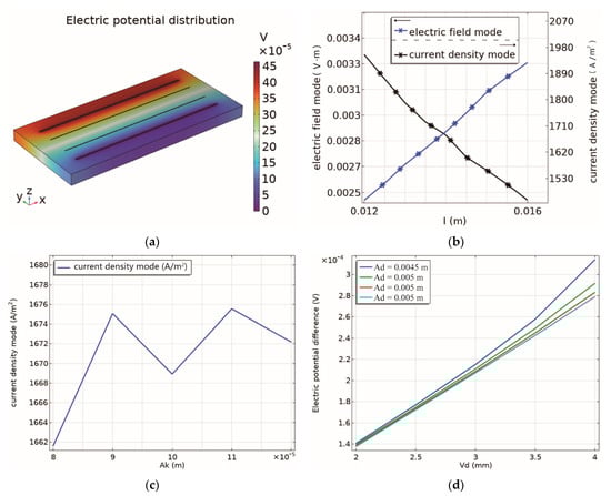 Figure 3. (a) The distribution of electric potential; (b) the effect of electrode length on current density and electric field strength; (c) the effect of current electrode width on current density; (d) the relationship between electrode spacing and voltage electrode potential.
